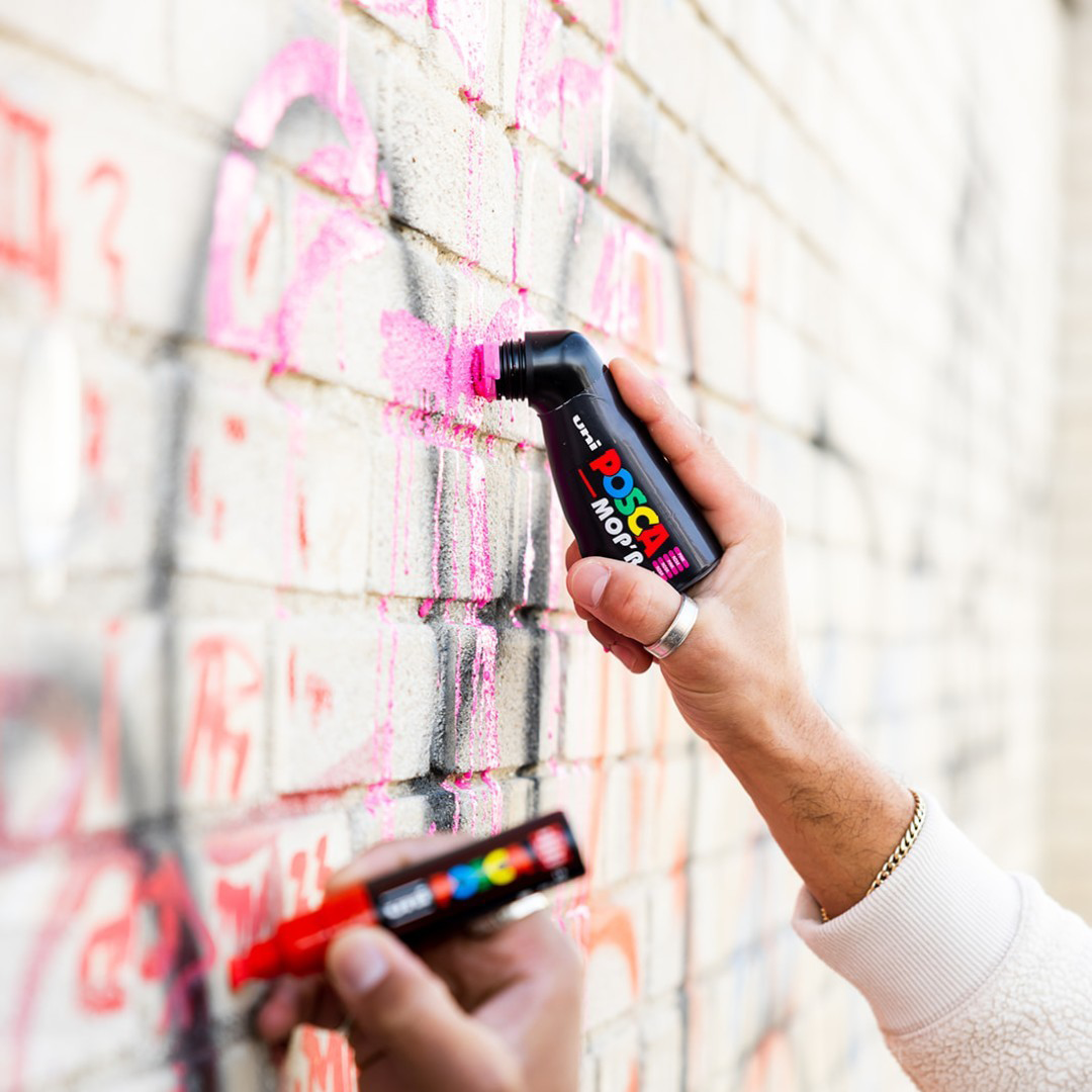 Mångsidigheten sträcker sig bortom spetsarna, Posca är nämligen känd för att kunna användas på i princip alla underlag du kan tänka dig! På vissa ytor blir färgen permanent, på andra kan du torka bort den.