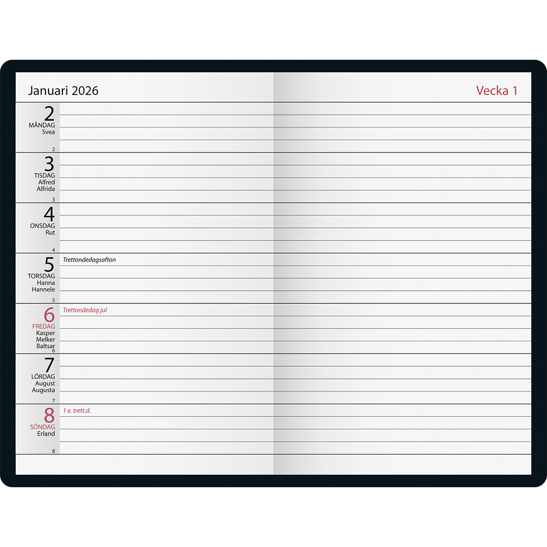 - Layout: Horisontella dagar, 1 vecka per uppslag