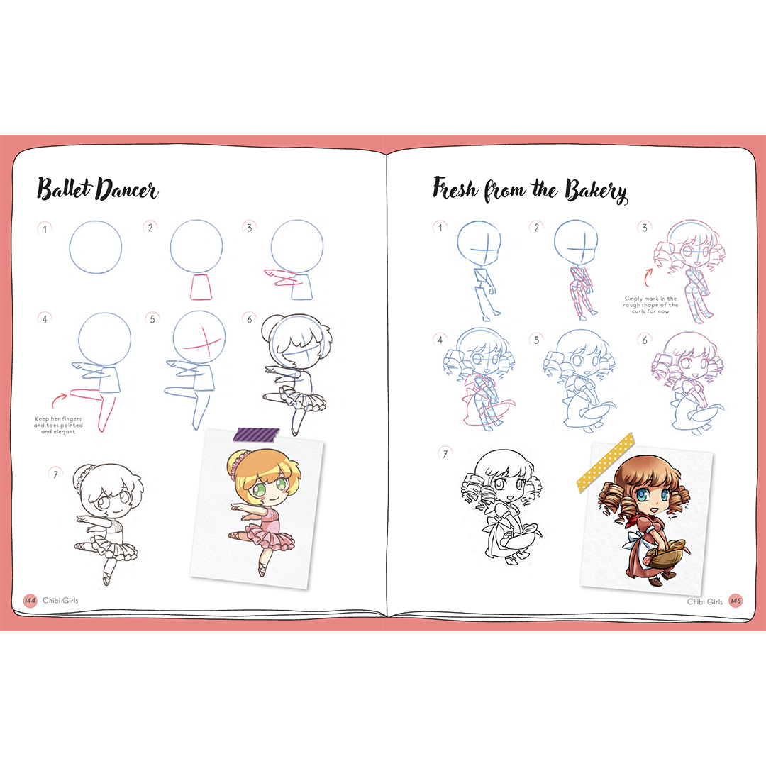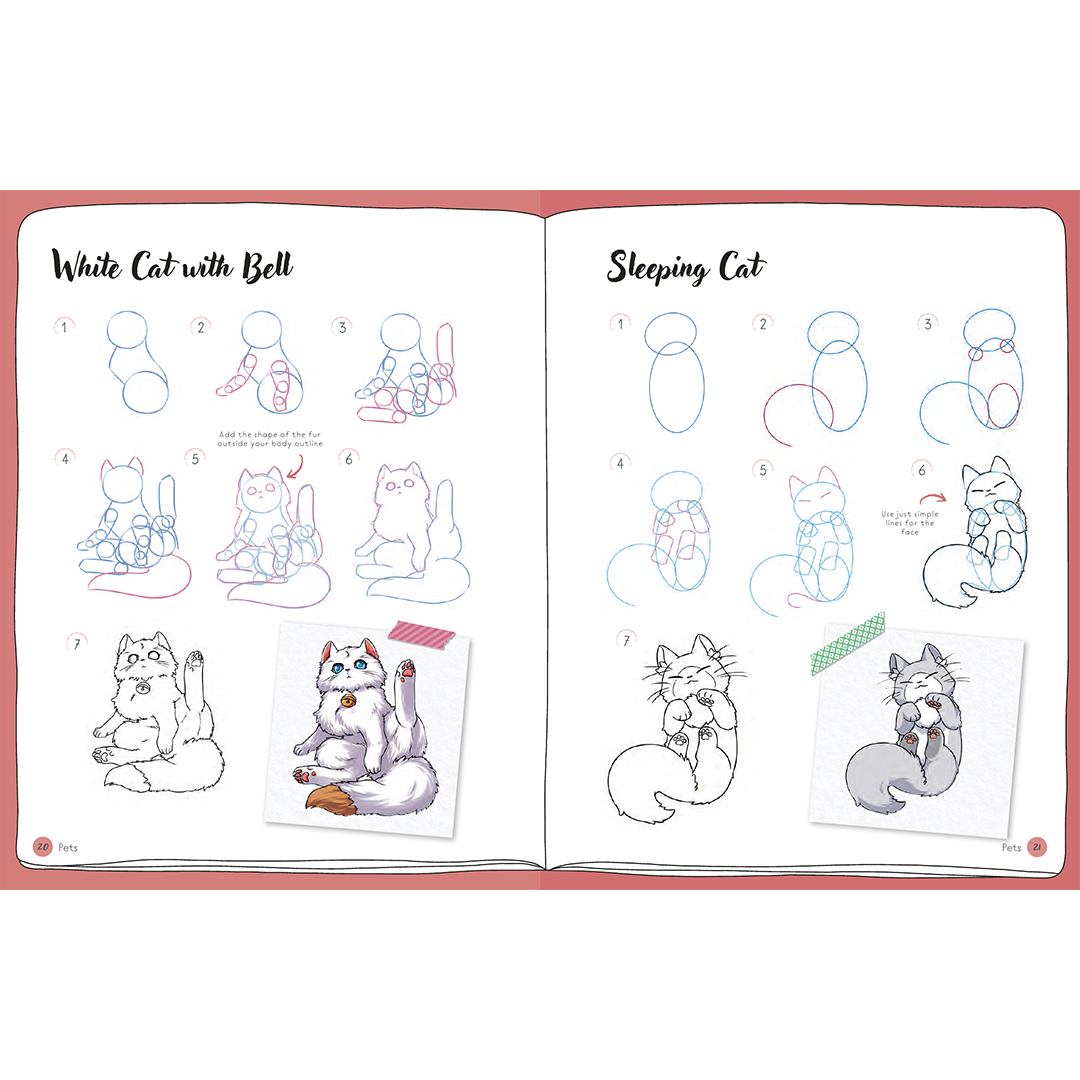 Varje steg-för-steg-projekt är uppbyggt i åtta enkla steg, som börjar med en grov skiss av grundformerna och gradvis byggs upp till en färdig, färglagd teckning.