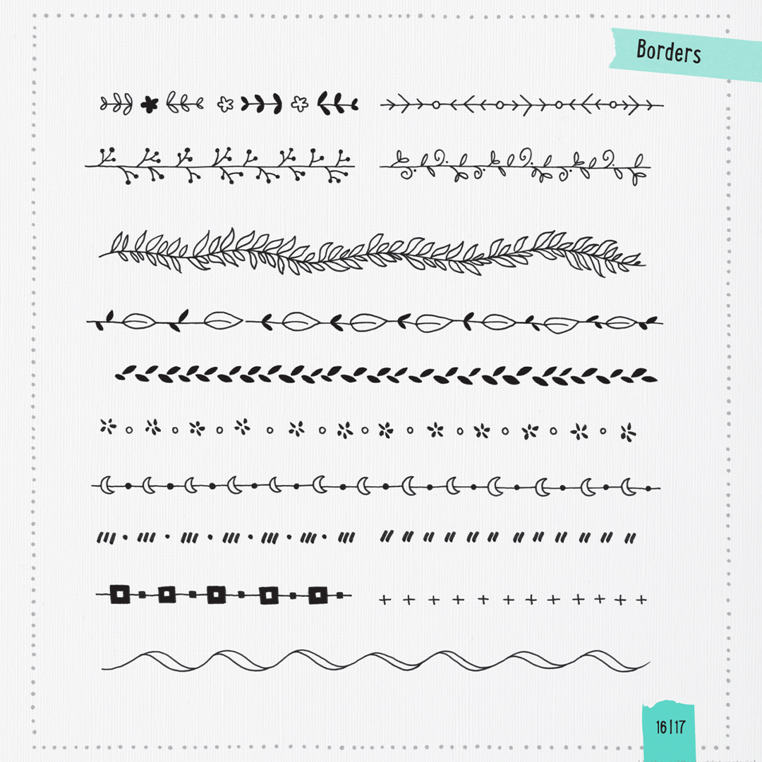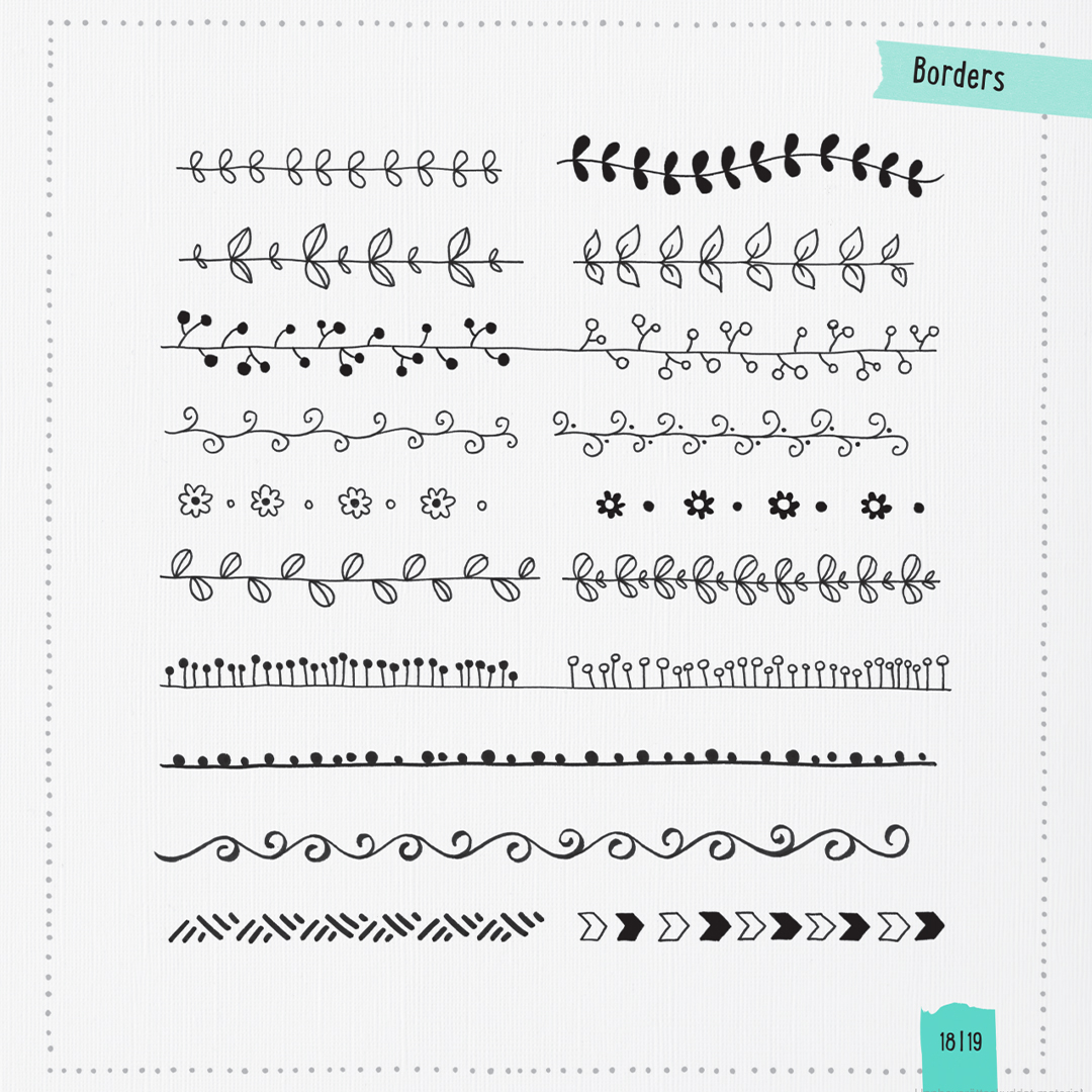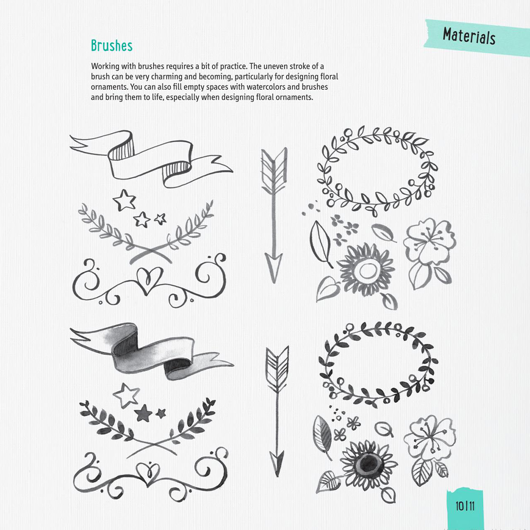 Hundratals ornament, alla ritade för hand av författaren, inkluderar dussintals alfabet och siffror. Du hittar också ramar, utsmyckningar och hörn som ger sidorna en elegant finish. De dekorativa motiven sträcker sig från pilar, hjärtan och stjärnor till löv, blommor och kransar.
