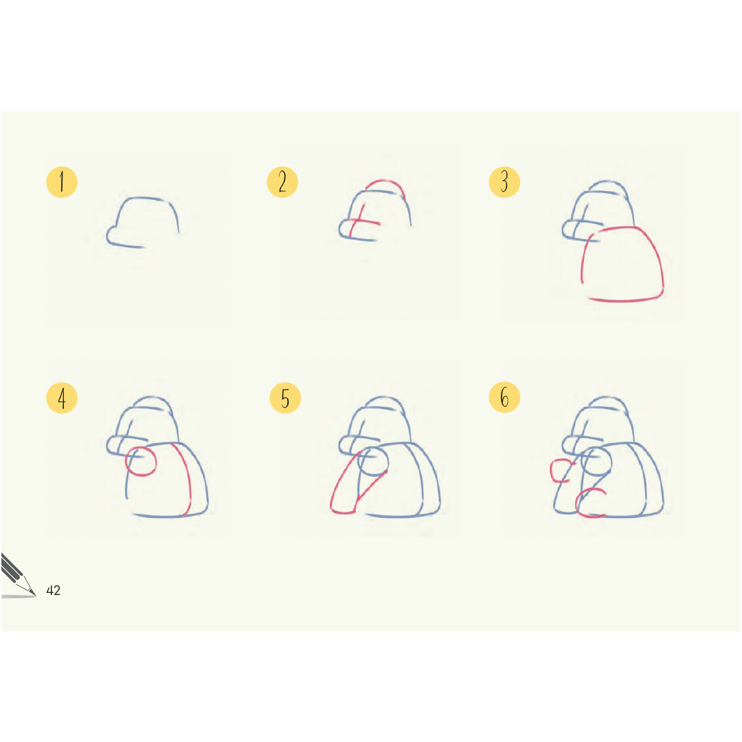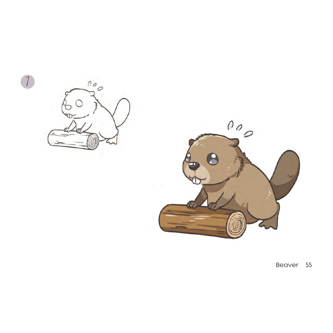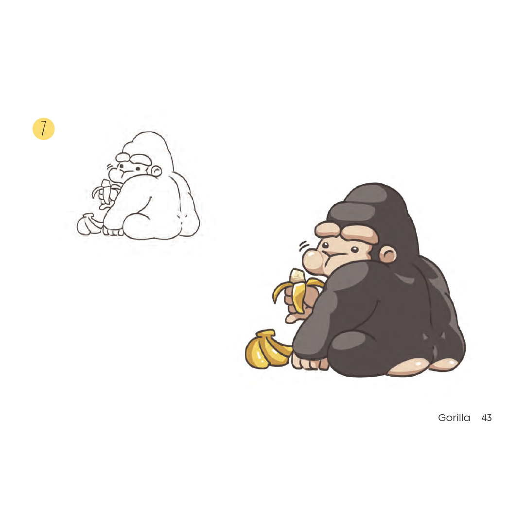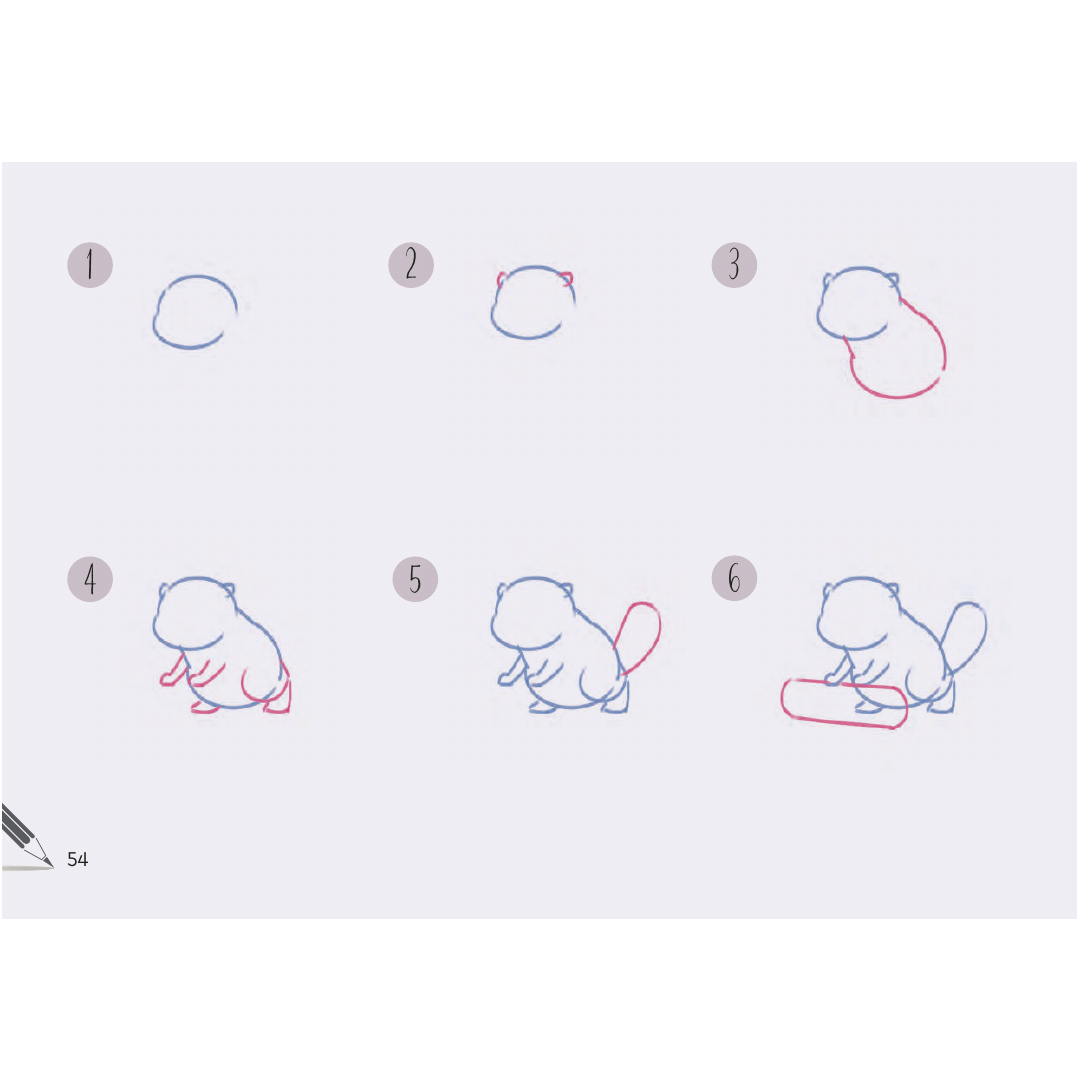 Varje djur utvecklas i 8 enkla steg, från en grov skiss av grundformerna till den färdiga, färglagda teckningen, med en enkel tvåfärgsmetod som tydligt visar varje steg.