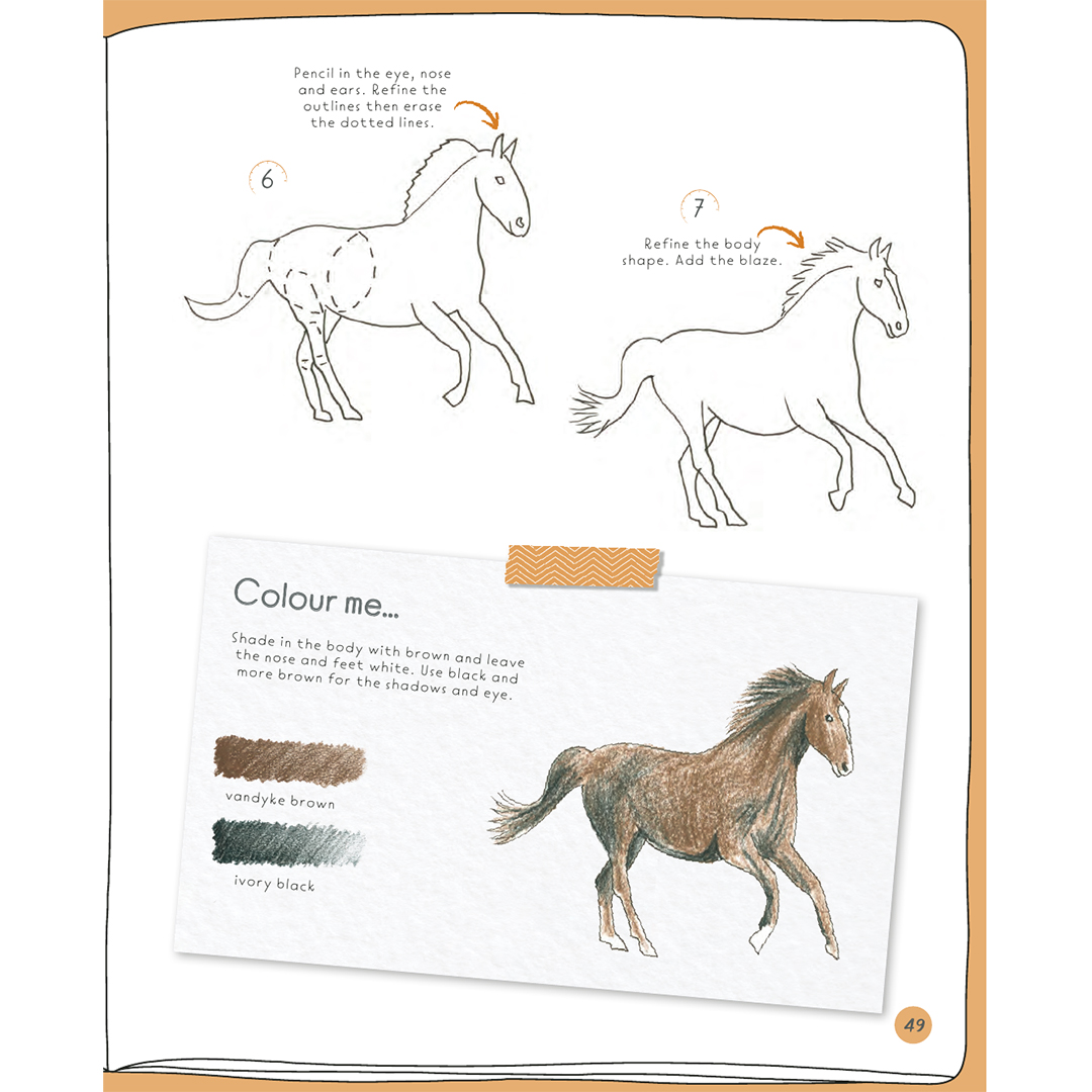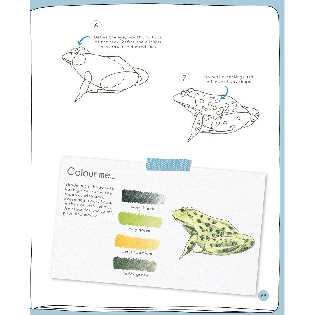 Varje projekt innehåller mellan 6 och 10 illustrerade steg, enkla instruktioner och en inspirerande ”färglägg mig”-ruta med färgprover och råd, om du vill ge din färdiga teckning liv med färg. I Jonathans exempel används färgpennor, men du kan använda vilket medium du vill.