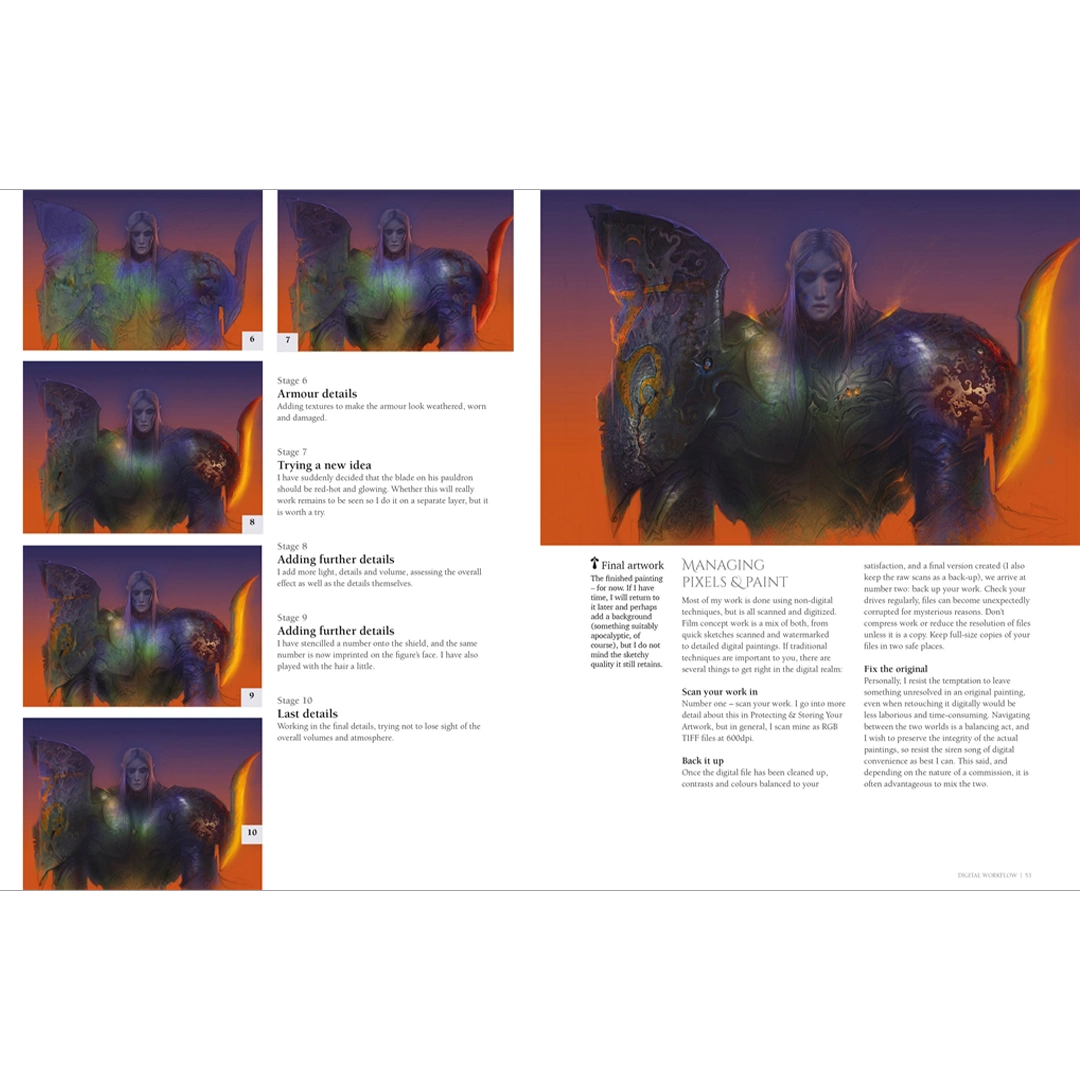 Boken utforskar också fantasylanskap och arkitektur samt hur man balanserar ljusa och mörka stämningar. Den avslutande delen ger ytterligare inspiration och vägledning i hur man presenterar sitt arbete i olika former, inklusive filmarbete, bokomslag och reklam – områden där John Howe har omfattande erfarenhet.