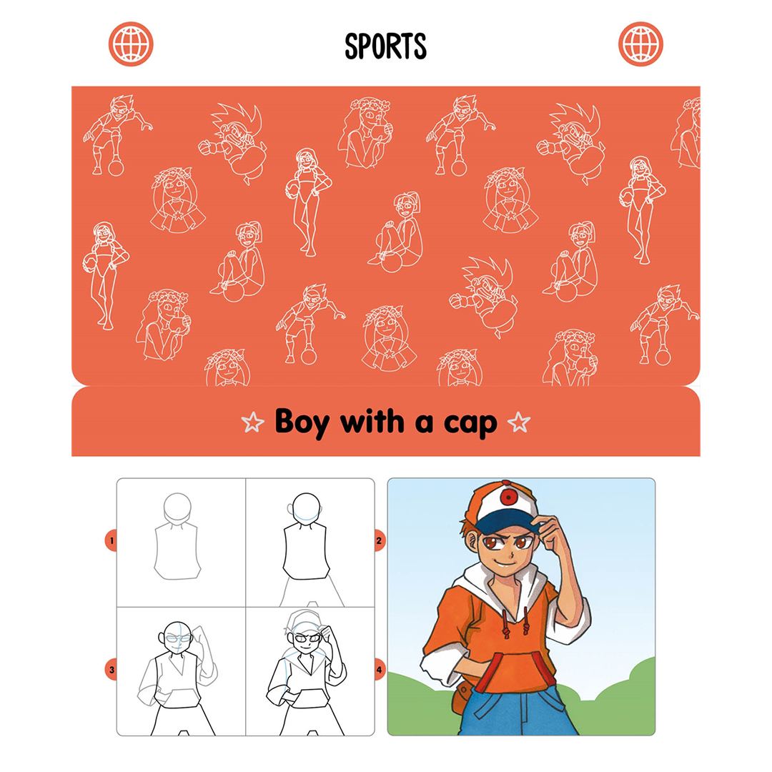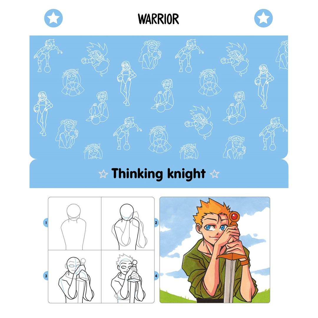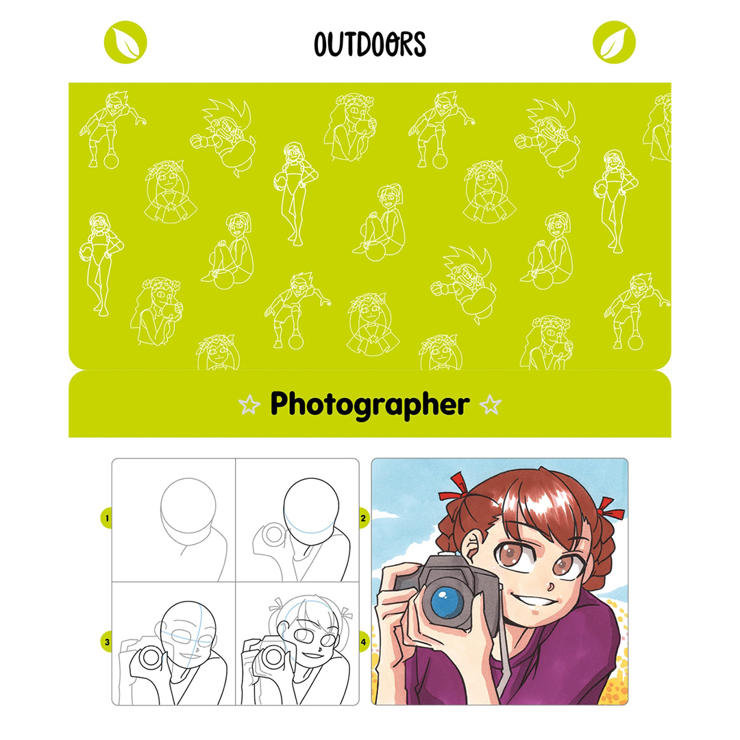 Lär dig hemligheterna bakom att rita manga, från att få rätt proportioner till att skapa personlighet med olika ansiktsuttryck och ge djup med lager av färg. Följ därefter 52 steg‑för‑steg‑sekvenser som visar exakt hur du bygger upp en stor mängd motiv, med enkla former som utgångspunkt och sedan stegvis tillägg av detaljer, struktur och färg. Varje sekvens är helt visuell, utan instruktioner att läsa, så det är verkligen enkelt att skapa dina egna mangafigurer. Allt du behöver är papper och några pennor!