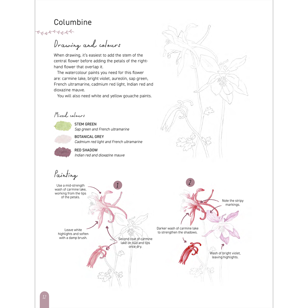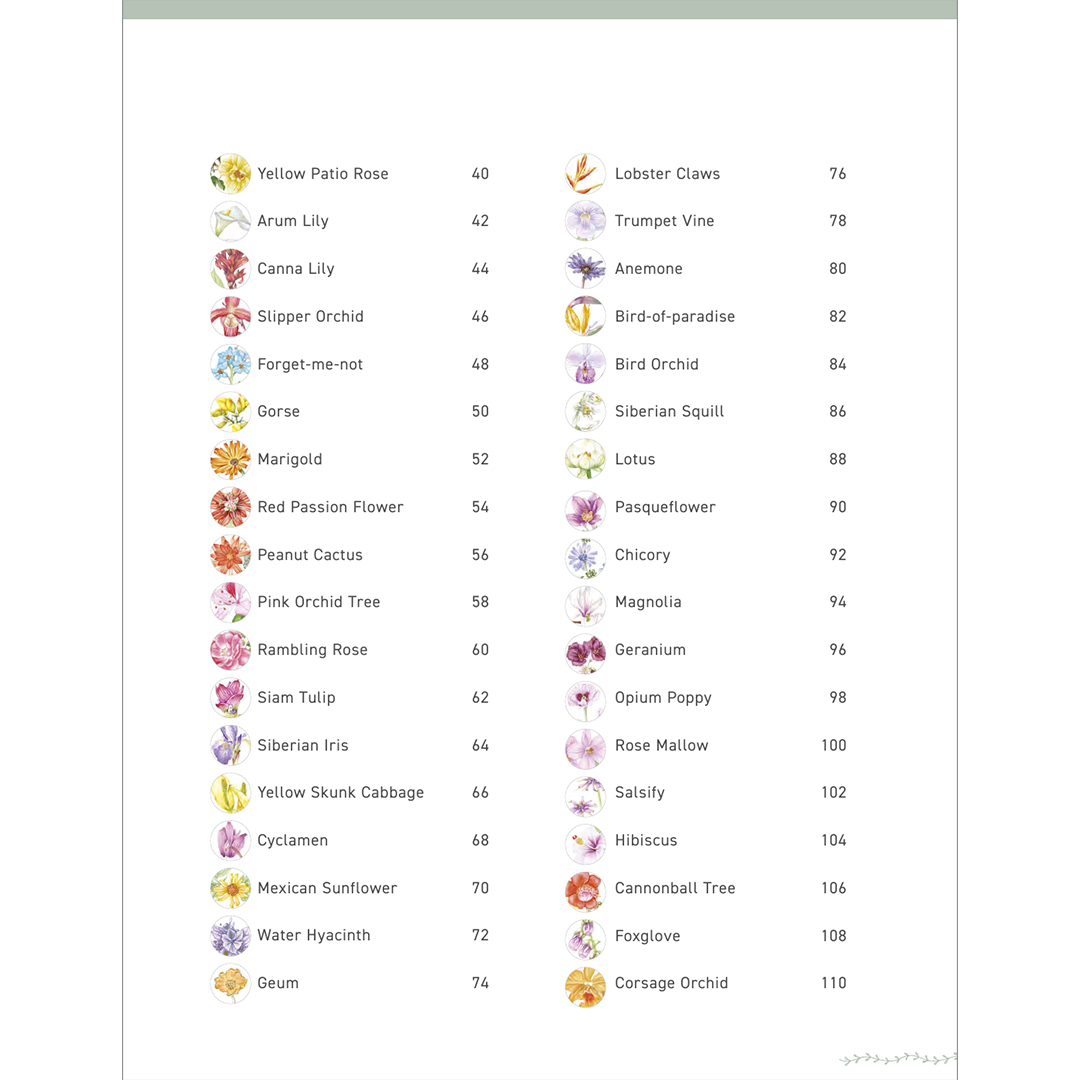 Boken innehåller en kort lista över verktyg och material för att komma igång, samt en tydlig och informativ guide till de grundläggande tekniker som behövs för att måla den här varierade samlingen av blommor.