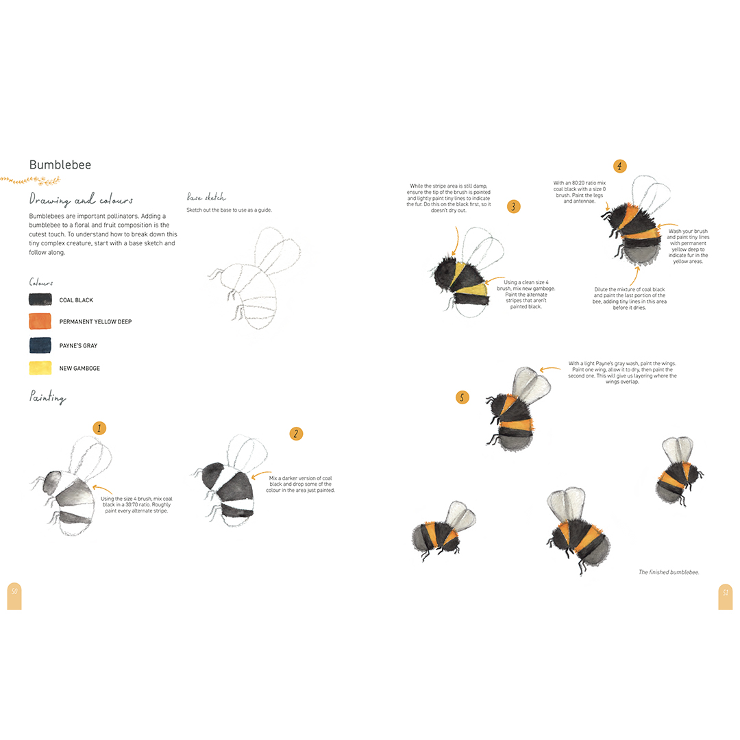 Skapa färgrika, mjukt övergående akvarellvinjetter med fint detaljerade blommor, saftig grapefrukt, fluffiga humlor, starkt färgade svampar och mycket mer!