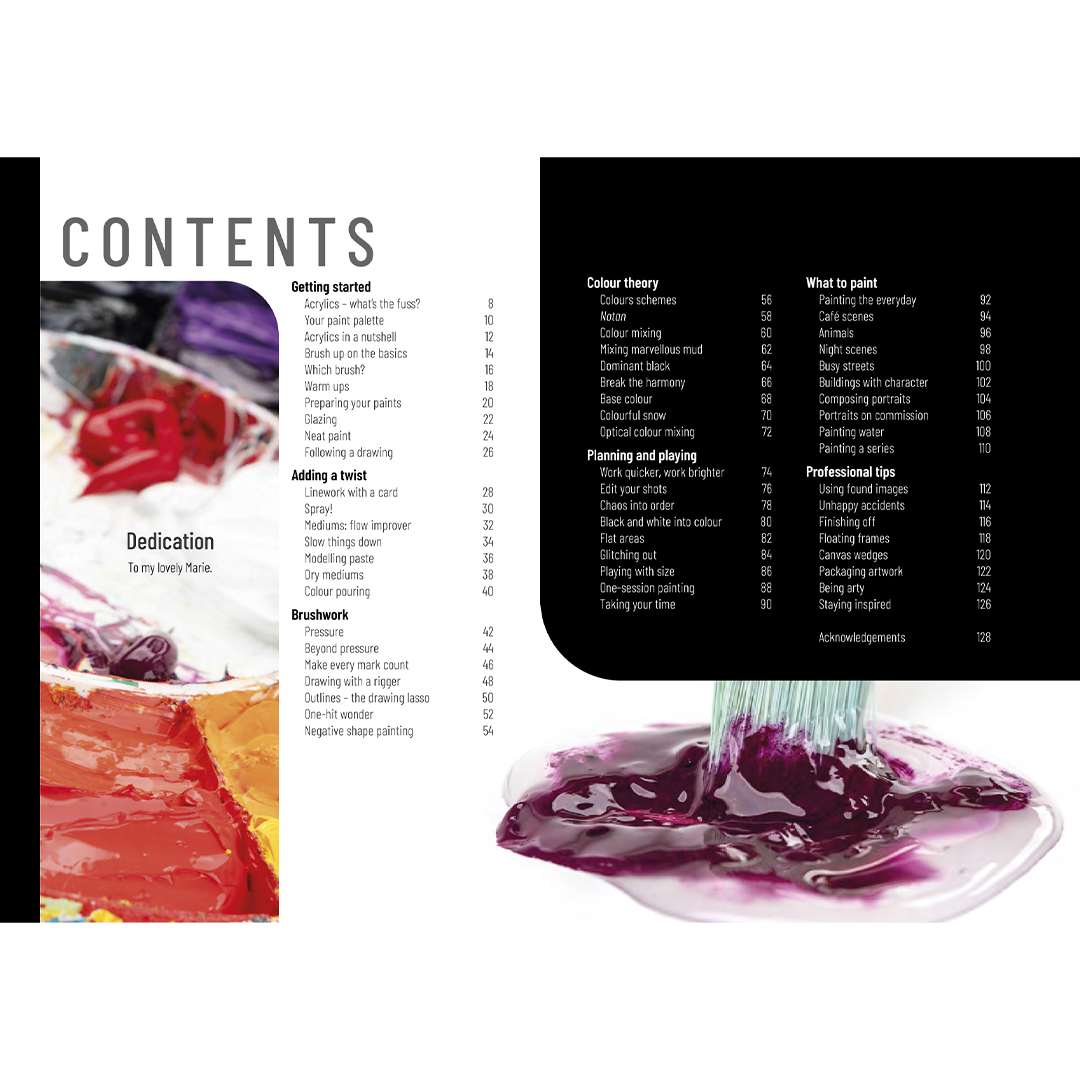 I denna innovativa mini‑guide, styrd av idéer mer än av teknik, visar mästerkonstnären och bästsäljande författaren Hashim Akib hur mångsidig och levande akrylmålning kan vara. Boken innehåller 64 praktiska övningar och inspirerande insikter om ett brett spektrum av motiv – från porträtt till urbana landskap – och med olika arbetssätt som att daska färg, arbeta på en grundfärg och forma kaos till ordning. Guiden är idealisk för nybörjare och målare på mellannivå och ger dig nya idéer, ställer kreativa krav och uppmuntrar till att utveckla din egen unika stil.