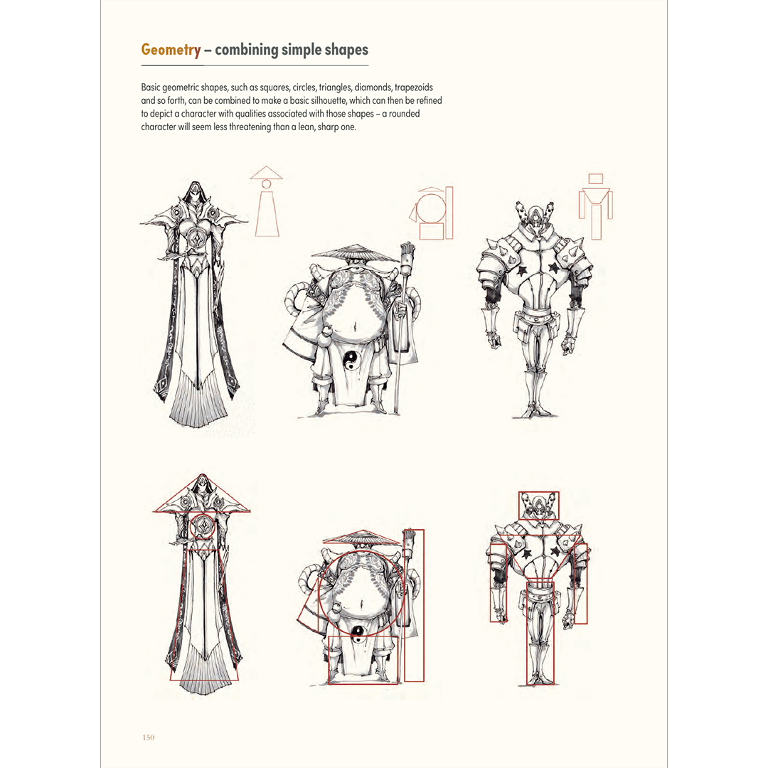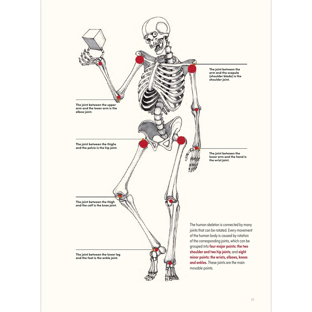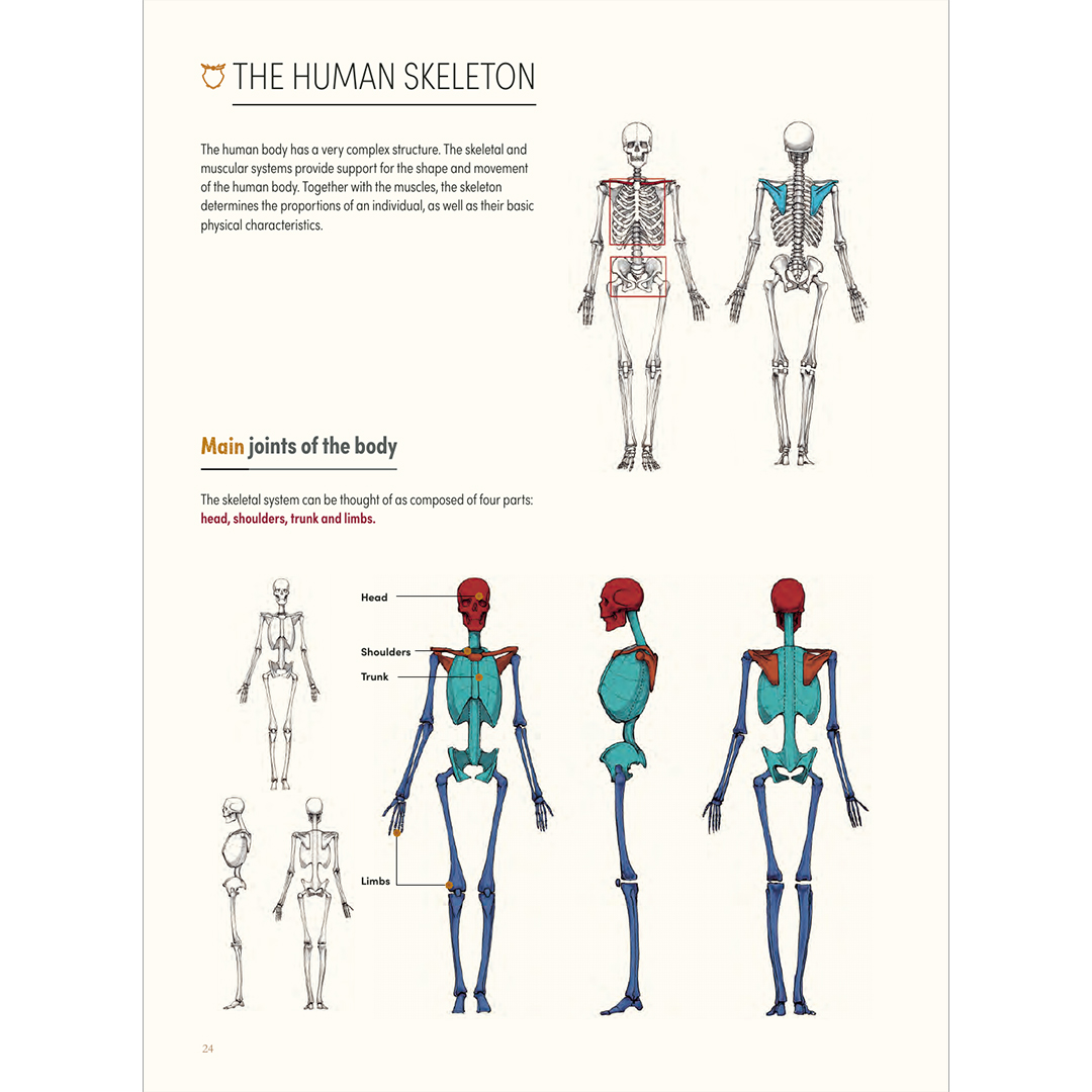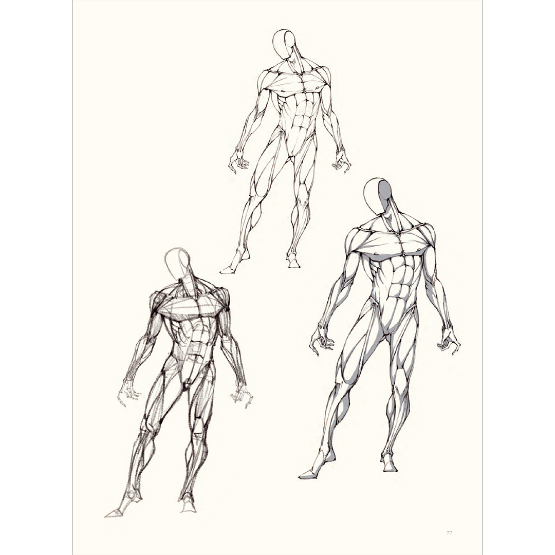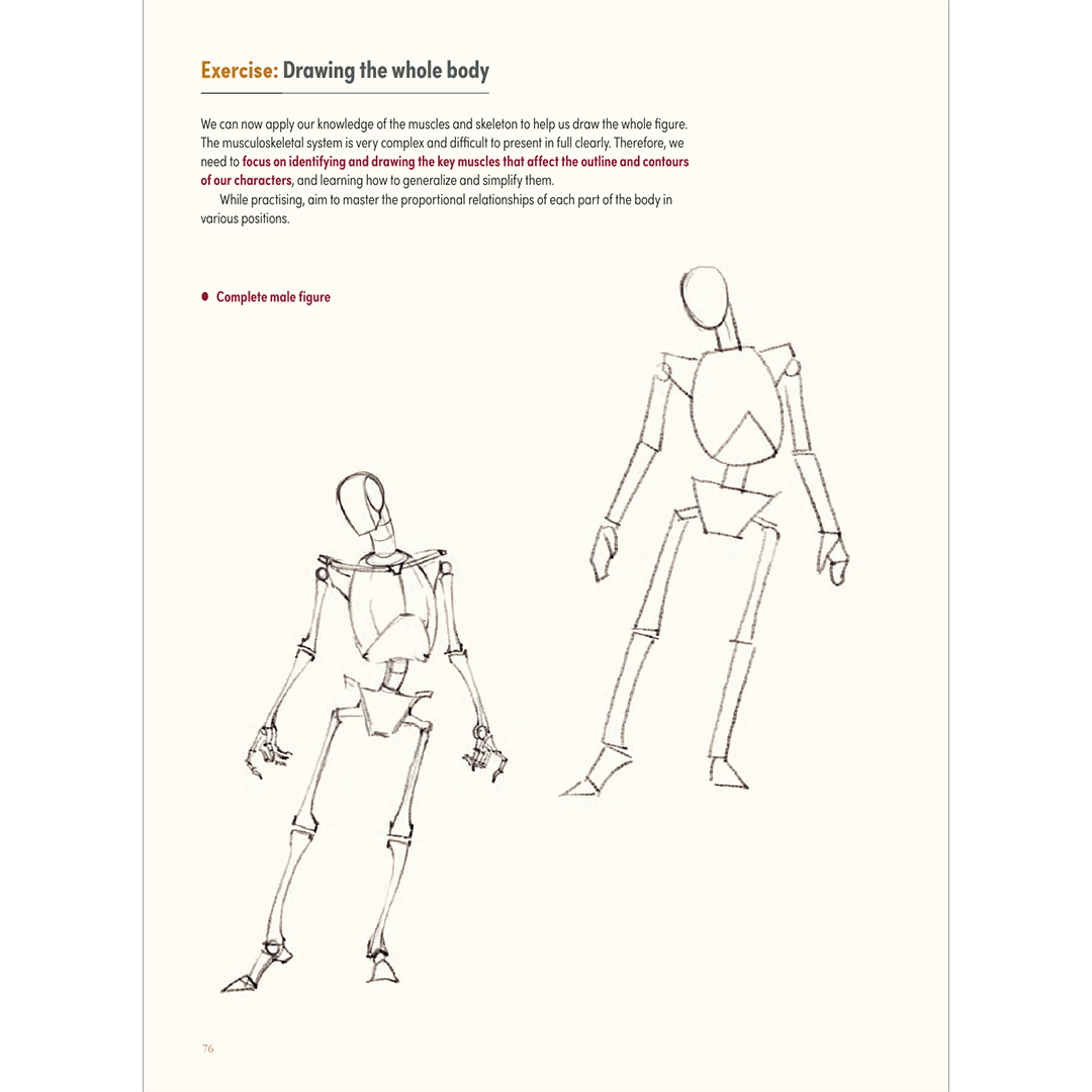 Människoanatomi och kinetik: Förstå strukturen och rörelsen som utgör grunden för all karaktärsdesign. Skelett- och muskelsystemen utforskas på flera sätt, från traditionella muskel-skelettillustrationer till linje- och kubformer. Inkluderad är också en guide till att skapa händer, fötter, lemmar och ansiktsdrag fulla av karaktär och uttryck.