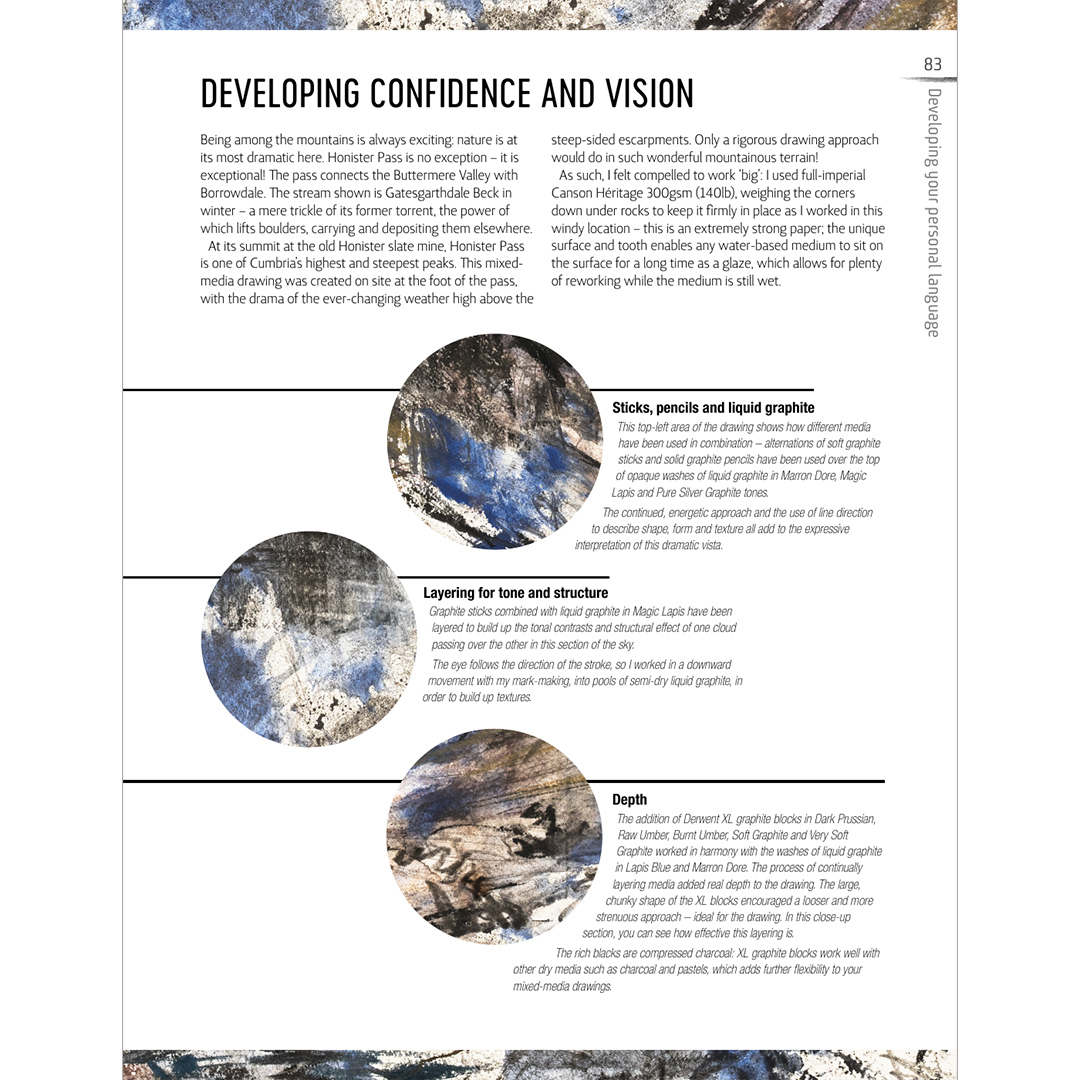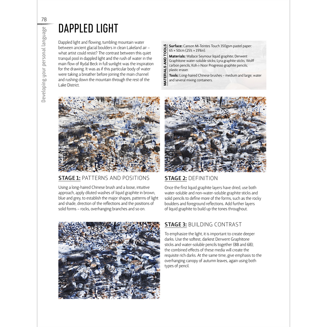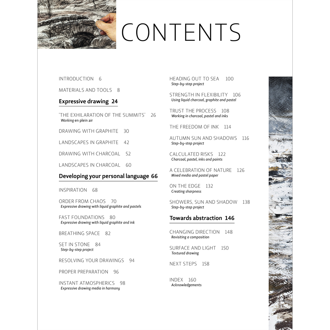 Den här boken riktar sig till konstnärer som vill utforska nya sätt att använda olika teckningsmaterial för att skapa uttrycksfulla och dramatiska landskap. Konstnären och författaren Robert Dutton använder sin kraftfulla och fria tecknings- och måleristil för att fånga landskapets känsla, kraft och dramatik. Han kombinerar material som flytande grafit, bläck, metalliskt bläck, kol och vattenlösliga kritor och pasteller, och experimenterar även med collage.