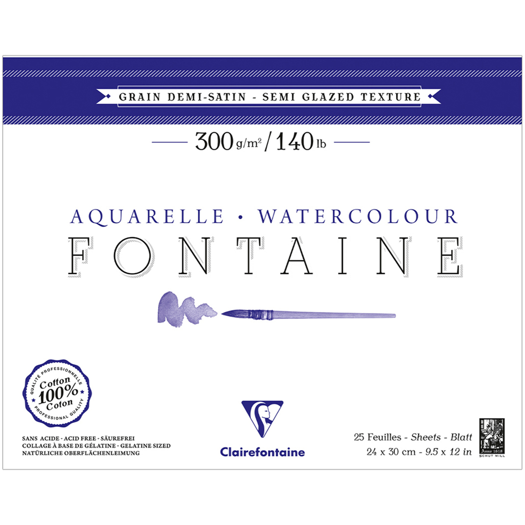 Fontaine Semi-Glazed 300g – Akvarellblock med 25 ark av högsta tänkbara kvalitet! Pappret har en nästan slät och behagligt följsam yta som ger god kontroll över färg och form. Papprets unika struktur gör det särskilt väl lämpat för blandtekniker, där man kombinerar olika tekniker. Även om ytan nästan är slät är den inte hal, vilket gör det lättare att arbeta med precisa detaljer och skapa rena linjer utan att färgen flyter ut. Det passar utmärkt för konstnärer som vill uppnå både skärpa och subtila övergångar i sina verk.