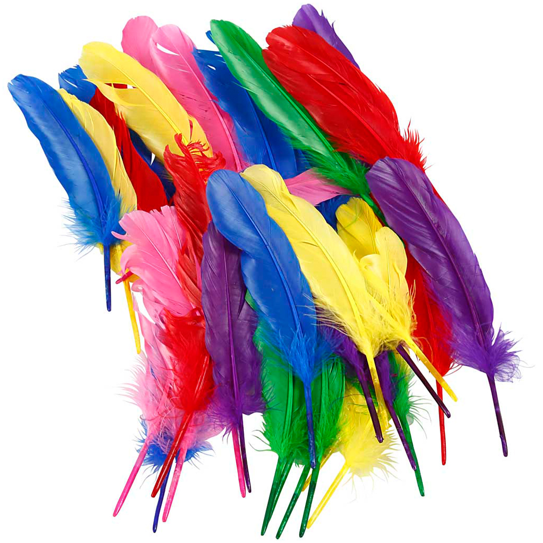 Förpackning med 36 färgade hönsfjädrar i 6 olika färger, perfekt för dekorationer, masker, påskpyssel och andra kreativa DIY-projekt. Med en längd på cirka 20 cm är fjädrarna lagom stora för både barn och vuxna att arbeta med och lätta att limma, knyta eller fästa på olika material.