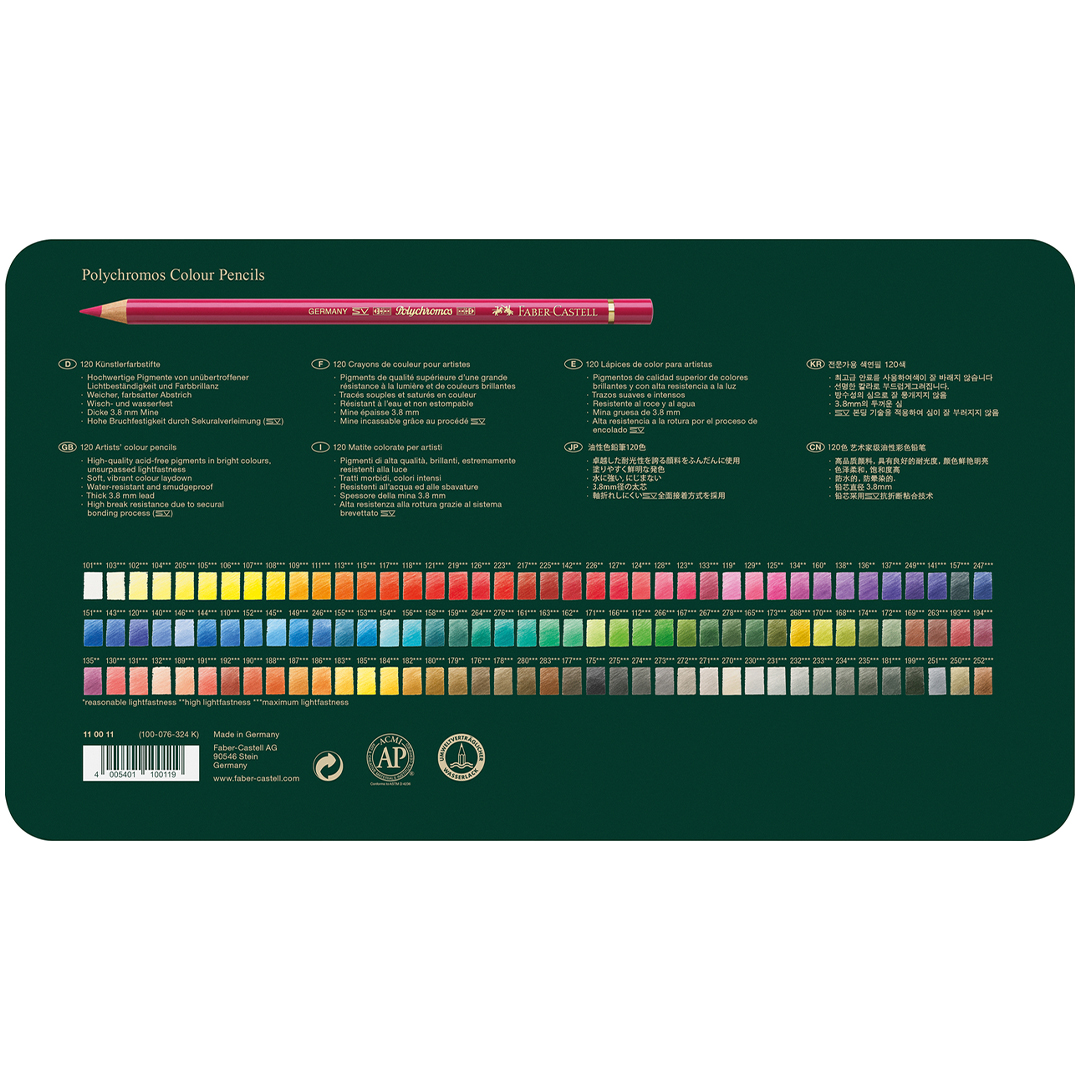 Med högkvalitativa, syrafria pigment levererar Polychromos oslagbar ljusäkthet som bevarar färgernas briljans i årtionden, tillsammans med maximal brottresistens, smet- och vattenresistens samt exceptionella teckningsegenskaper.