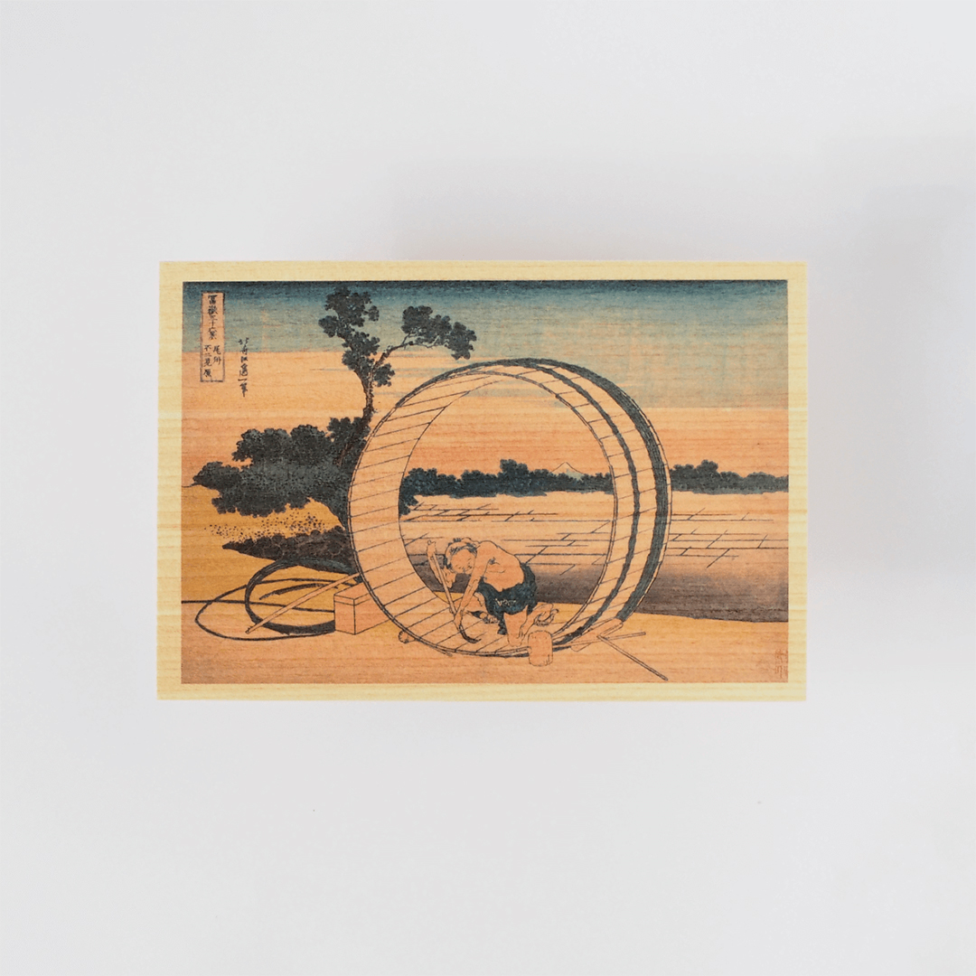 Ett set med sex vykort tillverkade i äkta japansk hinoki-trä (cypress), tryckta med klassiska ukiyo-e-motiv av Katsushika Hokusai ur serien Views of Mount Fuji.