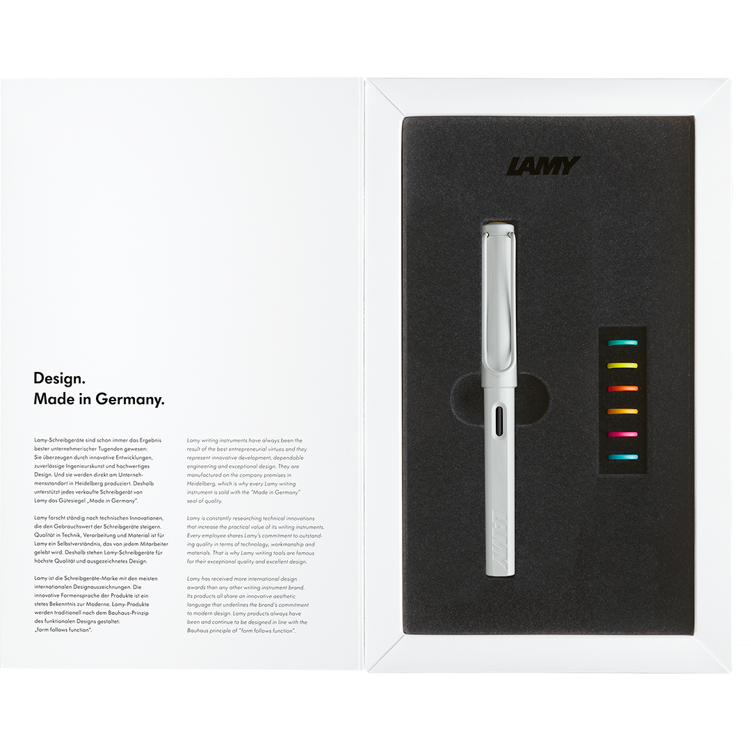 Pennan levereras med blå en LAMY T 10-bläckpatron och med stålspets i medium-bredd som ger en mjuk och pålitlig skrivupplevelse vid varje skrivtillfälle. Setet är förpackat i en stilren presentask och är en perfekt present till både den som precis börjat upptäcka skrivglädjen och till erfarna pennsamlare. Med LAMY Safari Multicolour blir varje skrivstund en chans att uttrycka sin personlighet.