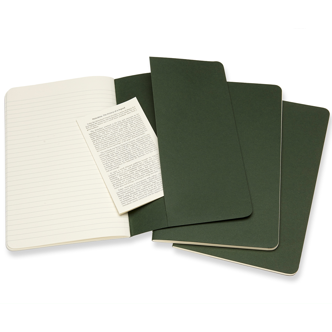 Set om 3 st anteckningsböcker i Large-storlek (13 x 21 cm) från italienska Moleskine. Varje bok innehåller 64 sidor, varav de sista 16 är uttagbara. Sydd bindning och innerficka. Syrafritt papper av hög kvalitet!