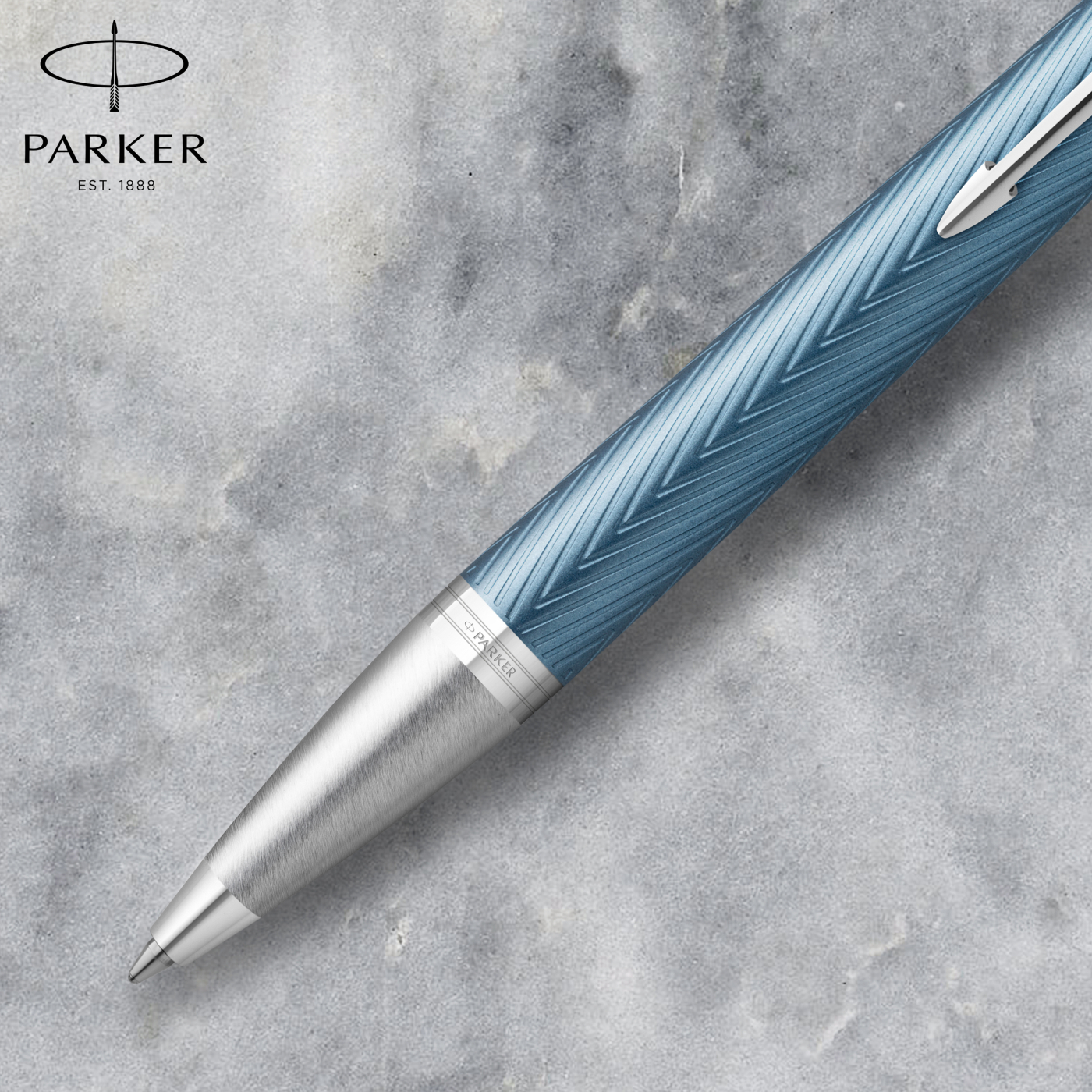 Blickfångande blå metallisk lack med graverat chevronmönster och detaljer i krom. Fylls på med Parkers egna kulspetspatroner. Levereras i enklare presentask med en patron inuti. Denna variant finns också som rollerball- och reservoarpenna.