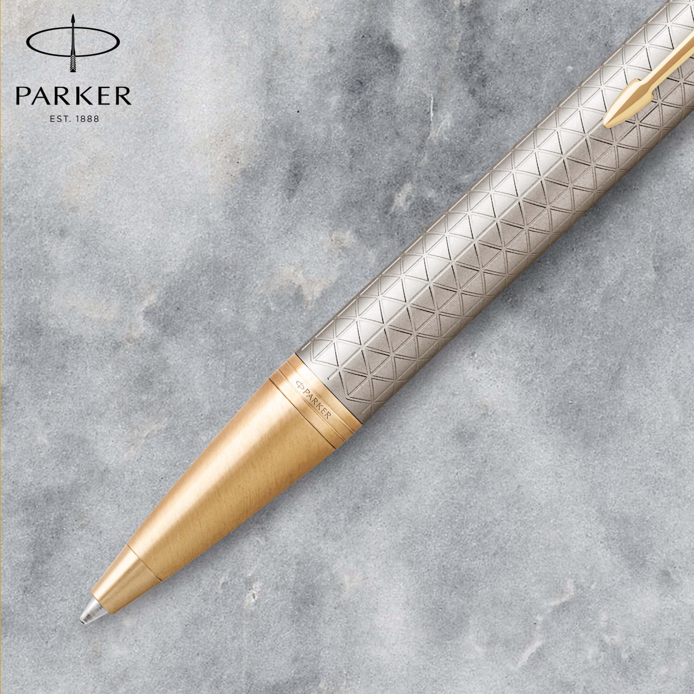Glansigt lack i varm silverfärg med graverat diamantformat mönster och guldpläterade detaljer. Fylls på med Parkers egna kulspetspatroner. Levereras i enklare presentask med en patron inuti. Denna variant finns också som rollerball- och reservoarpenna.