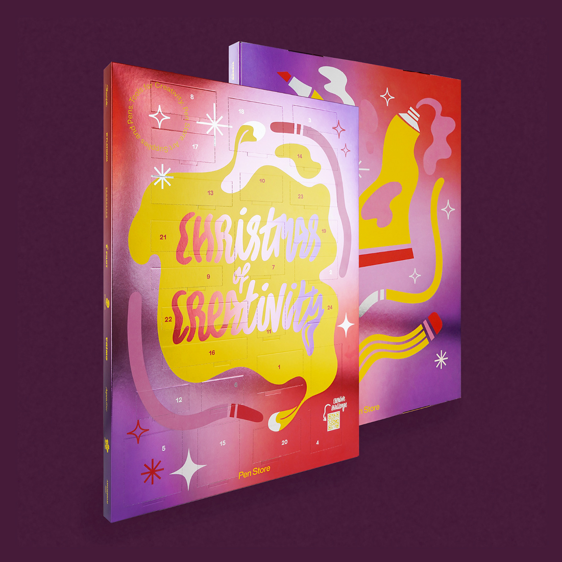Årets kalender glänser likt en julgranskula och rymmer produkter från några av de främsta tillverkarna: Sakura, Aquafine, Sennelier, Platinum, Staedtler, Sharpie, Primo, Pilot, Amsterdam, Leuchtturm1917, Lyra, Stabilo, Giotto, ZIG Kuretake, Ecoline, Rhodia, Raphael och Blockx.