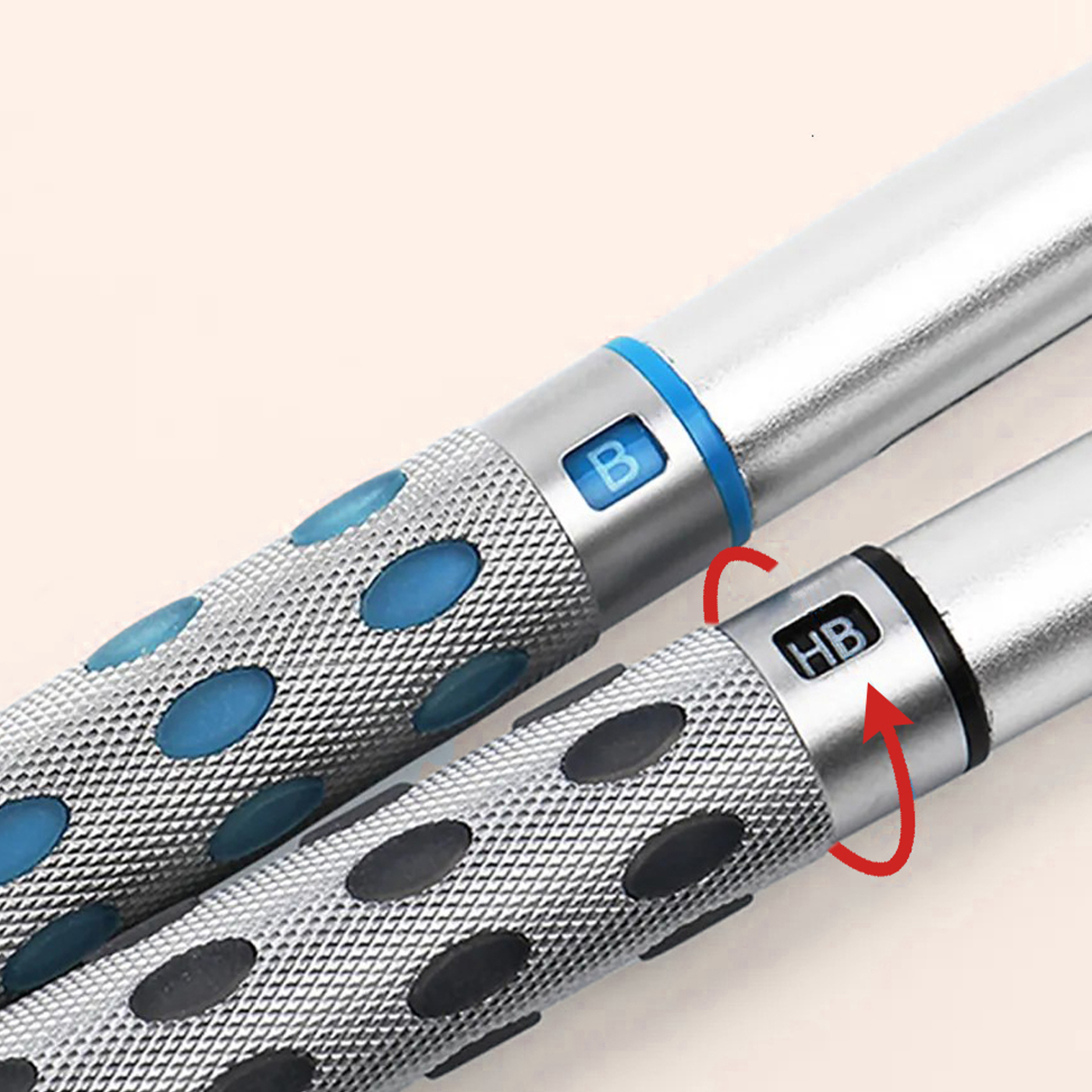 Smalt 4 mm fast stödrör i stål och mekanik i metall. Stödröret skyddas i kroppen när klippet trycks in. Radergummi i pennans topp. Fönster för indikering av stiftens hårdhetsgrad.