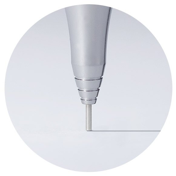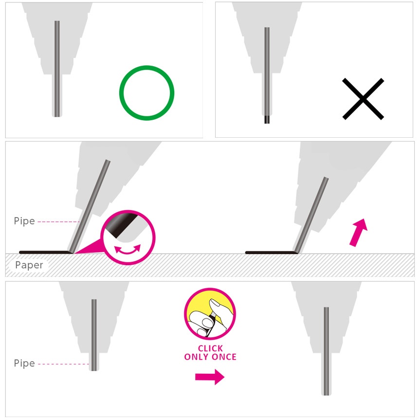 Innan du börjar skriva, klicka ut stiftet så att det syns. Håll sedan ner tryckknappen samtidigt som du försiktigt trycker ner spetsen mot papperet så att stiften inte längre syns. Nu kan du börja skriva!