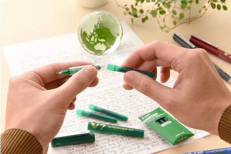 Byt patron, inte penna. Nästan alla pennor i Begreen-serien är påfyllningsbara, vilket minskar plastavfall, sänker utsläpp och gör att pennan kan hänga med länge. På varje produktsida ligger rätt refill länkad, så det blir enkelt för dig.