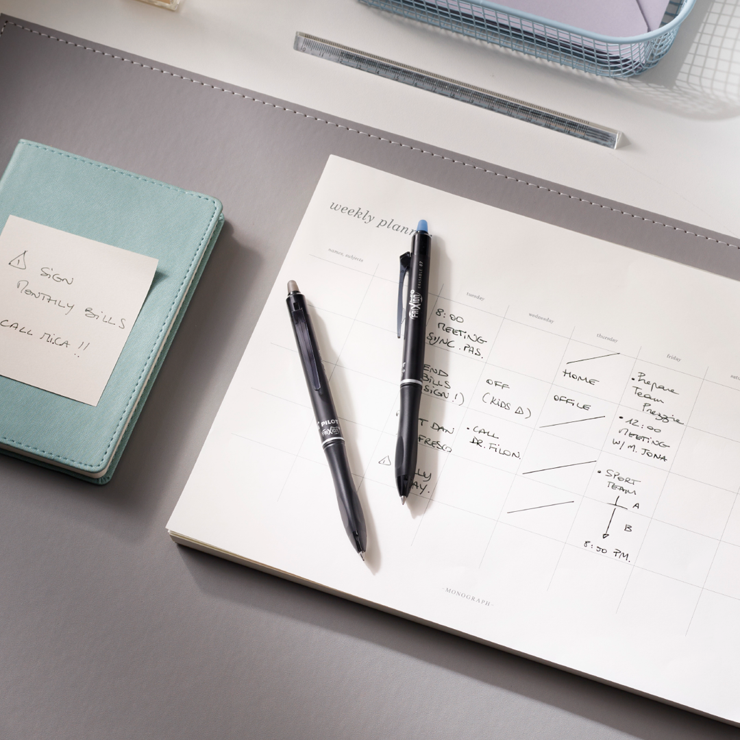 Första raderbara bläckpennan av återvunnen plast. Dessutom är den stilren för det vuxna skrivbordet. Och har ett triangulärt grepp som ligger skönt i handen. En stor nyhet för alla FriXion-fans!