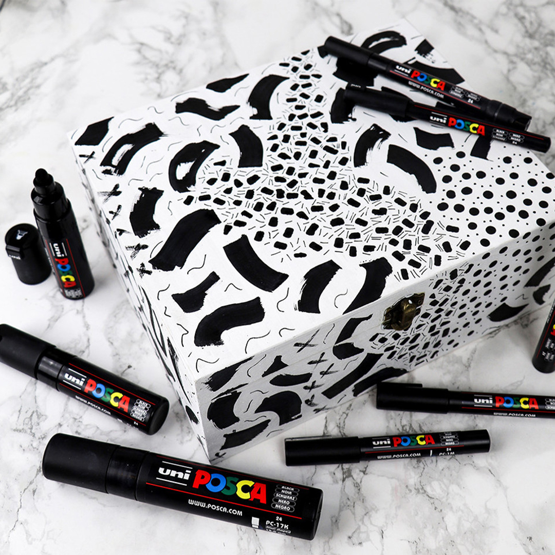 Bläcket är vattenbaserat och lägger sig ovanpå ytan, täcker mycket bra även på svart yta. Färgen torkar snabbt och blöder inte. Helt enkelt en mycket rolig marker!