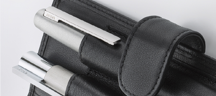 Pennfodralen är tillverkade i kornat eller exklusivt kalvskinn med diskret Lamy‑prägling och robust magnetlås eller dragkedja för säker stängning. Den genomtänkta designen gör dem enkla att bära med sig i väska eller portfölj och skyddar effektivt dina favoritskrivarbeten mot repor och slitage.