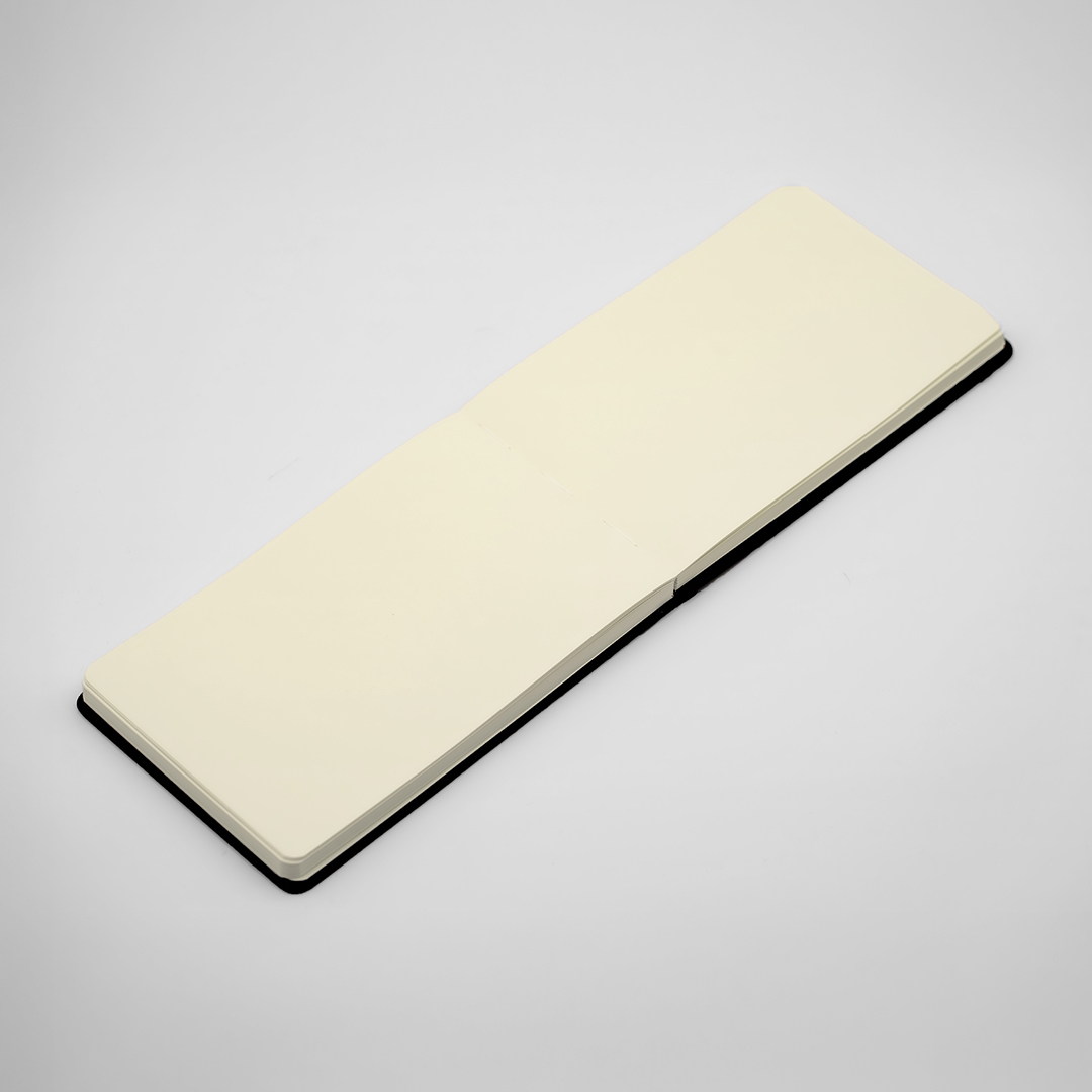 Omslaget är tillverkat av veganskt läder med textilklädd rygg av hampatyg. Boken är trådbunden vilket möjliggör att den kan ligga platt mot underlaget när du skriver eller skissar. Längst bak i boken finns en praktiskt ficka där du kan förvara lösa ark eller lappar. Den har även ett elastiskt band som håller boken stängd och skyddar sidorna när den inte används.