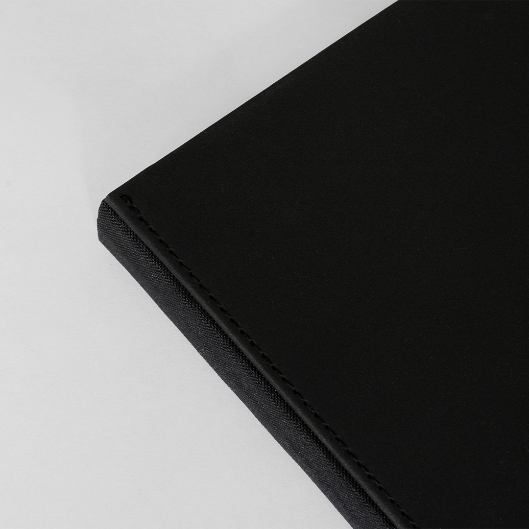 Omslaget är tillverkat av veganskt läder med textilklädd rygg av hampatyg. Boken är trådbunden vilket möjliggör att den kan ligga platt mot underlaget när du skriver eller skissar. Längst bak i boken finns en praktiskt ficka där du kan förvara lösa ark eller lappar. Den har även ett elastiskt band som håller boken stängd och skyddar sidorna när den inte används.
