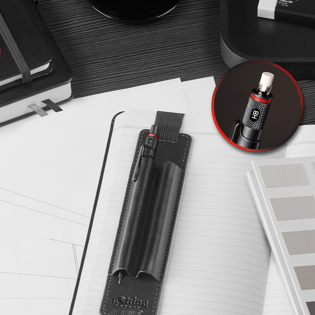Setet innehåller: En svart Rotring 600 stiftpenna 0,5 mm. En linjerad anteckningsbok med elastiskt band som håller boken stängd när den inte används och rött märkband för snabb åtkomst. Ett elegant pennfodral utformat för att hålla två pennor, med elastiska band som fäster det vid anteckningsboken.