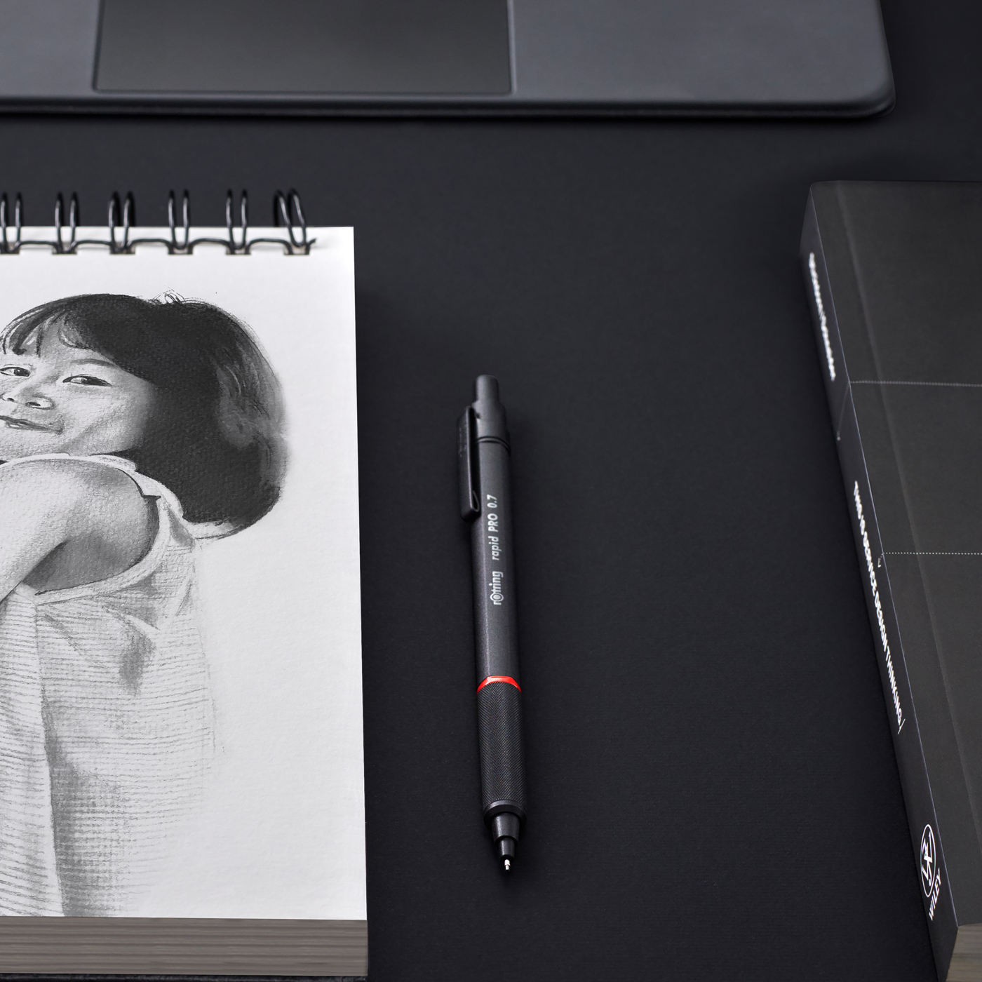 Stiftpennan Rotring Rapid Pro i en funktionell design som påminner om klassikern Rotring 600. Svart metallkropp med hexagonalformad överdel. Den cylinderformade nederdelen har en räffling som ger extremt bra grepp och således exakthet. Pennan har avtagbart metallclip och radergummi under huven. Stiftpenna 0,7 mm, rörligt stödrör. Levereras i presentförpackning.