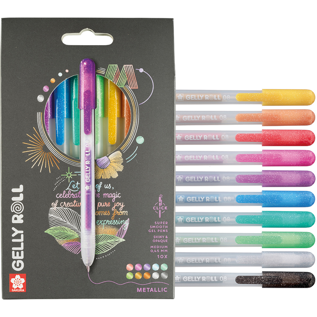 Förpackningen innehåller 10 klickbara gelpennor i metallicfärger: röd, rosa, lila, blå, grön, smaragd, guld, silver, koppar och svart.