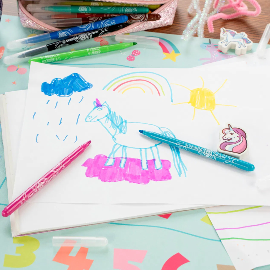 Power klarar att ligga utan kork upp till hela 8 veckor, vilket är en rekordlång “cap-off”-tid. Spetsen är rejäl och konstruerad för att klara av hårt tryck när den lilla konstnären målar som mest intensivt.