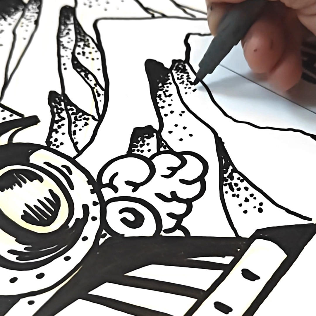Att bli begränsad på det här sättet gör att man behöver tänka om helt, vilket är roligt. Man får anpassa sig efter det man har och kanske släppa vissa idéer, om till exempel komplementfärger, vilka pennor som fungerar tillsammans och vilka som inte gör det på just det här materialet. Och jag älskade att rita på tunnelbanekartongen.