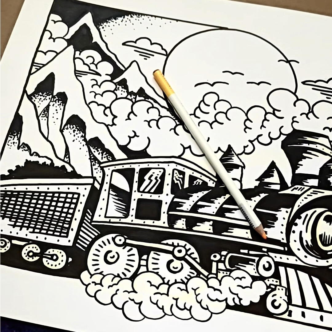 Jag gillar att arbeta med ett enkelt bildspråk, så tjocka svarta linjer och hög kontrast var givet i uttrycket. Jag gillar också att tydligt dela upp förgrund (tåget), mellangrund (bergen) och bakgrund (himlen), samt att tåget försvinner ut ur bild.
