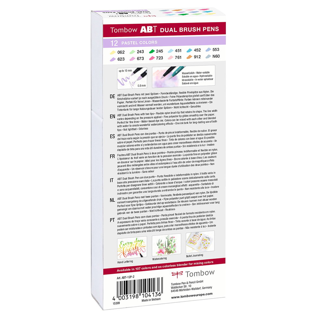 Setet innehåller 12 x ABT Dual Brush Pens: N60 cool grey6, 062 pale yellow, 243 mint, 245 sap green, 451 sky blue, 452 process blue, 553 mist purple, 623 purple sage, 673 orchid, 723 pink, 761 carnation, 912 pale cherry.