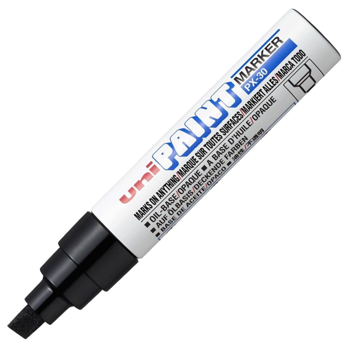 Unis populära Paint Markers är heltäckande och skriver på alla underlag. Färgen är oljebaserad, vattenfast och tålig. PX-30 har en 8 mm snedskuren udd och är mycket lämplig i industrimiljö. Den vita finns även i prisvärt 12-pack!