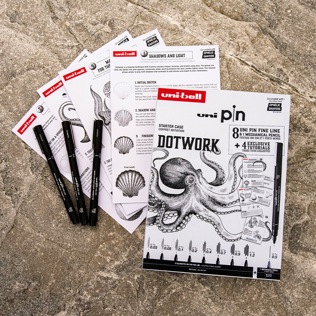 Detta set är särskilt designat för att erbjuda precision och kontroll, vilket resulterar i realistiska illustrationer med imponerande skuggor och djup. Setet innehåller åtta fineliners i olika spetsbredder och en 0,5 mm mekaniska stiftpenna. I setet ingår även inspirerande och pedagogiskt material i form av fyra instruktionsark och ett häfte som hjälper både nybörjare och mer avancerade tecknare att utveckla sin teknik och bygga upp egna, unika verk med dotwork.